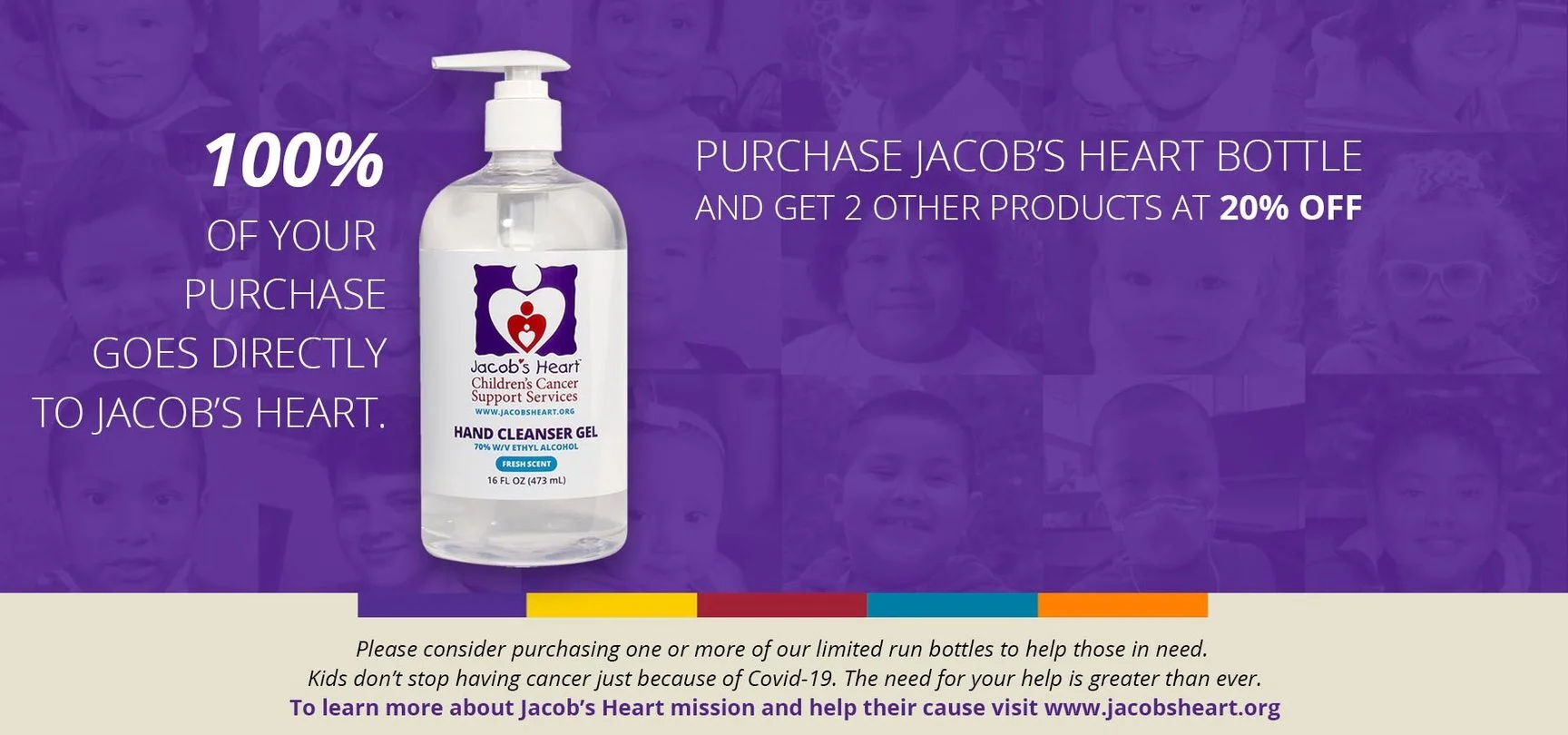Jacob’s Heart serves families in Santa Cruz, Monterey, San Benito and south Santa Clara counties. The limited edition 16oz Pump Bottle of hand cleanser will raise awareness and money for services that make battling cancer in the midst pandemic for families of sick children less stressful and lonely.